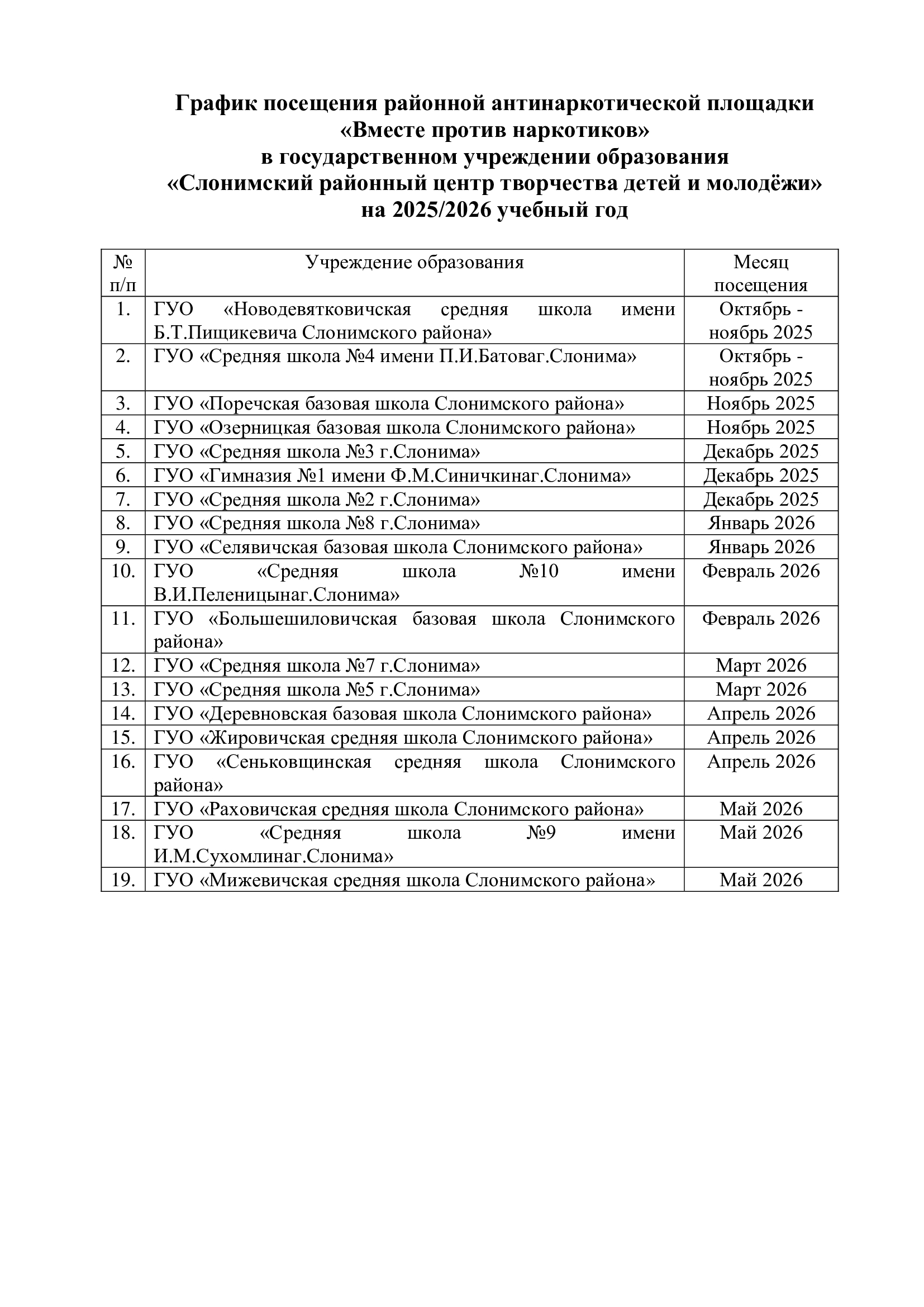 21 октября 2025 года в ГУО «Слонимский районный центр творчества детей и молодёжи» на базе районной антинаркотической площадки «Вместе против наркотиков» состоялось мероприятие с участием учащихся ГУО «Средняя школа №4 имени П.И.Батова г.Слонима» смотреть