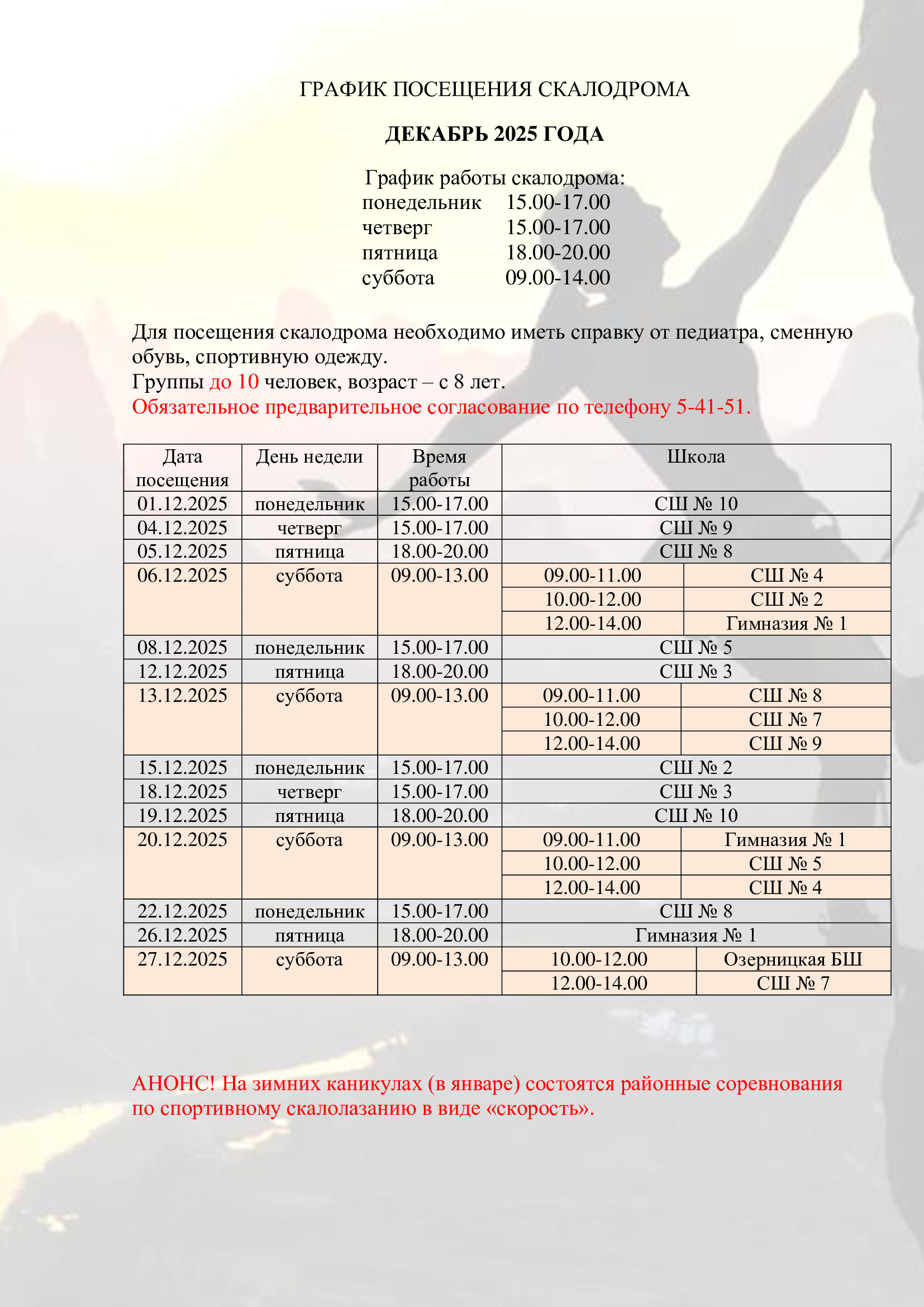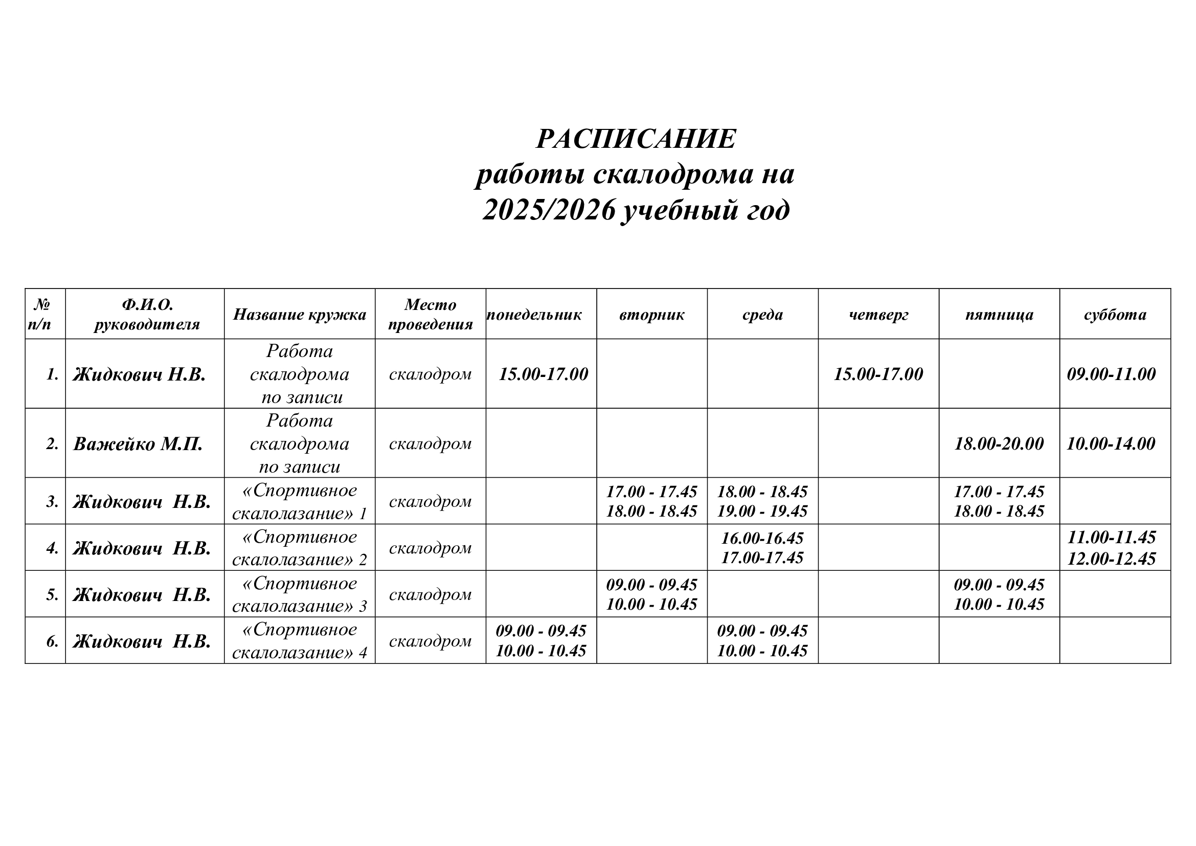 Расписание работы скалодрома на 1 полугодие 2025/2026 учебного года