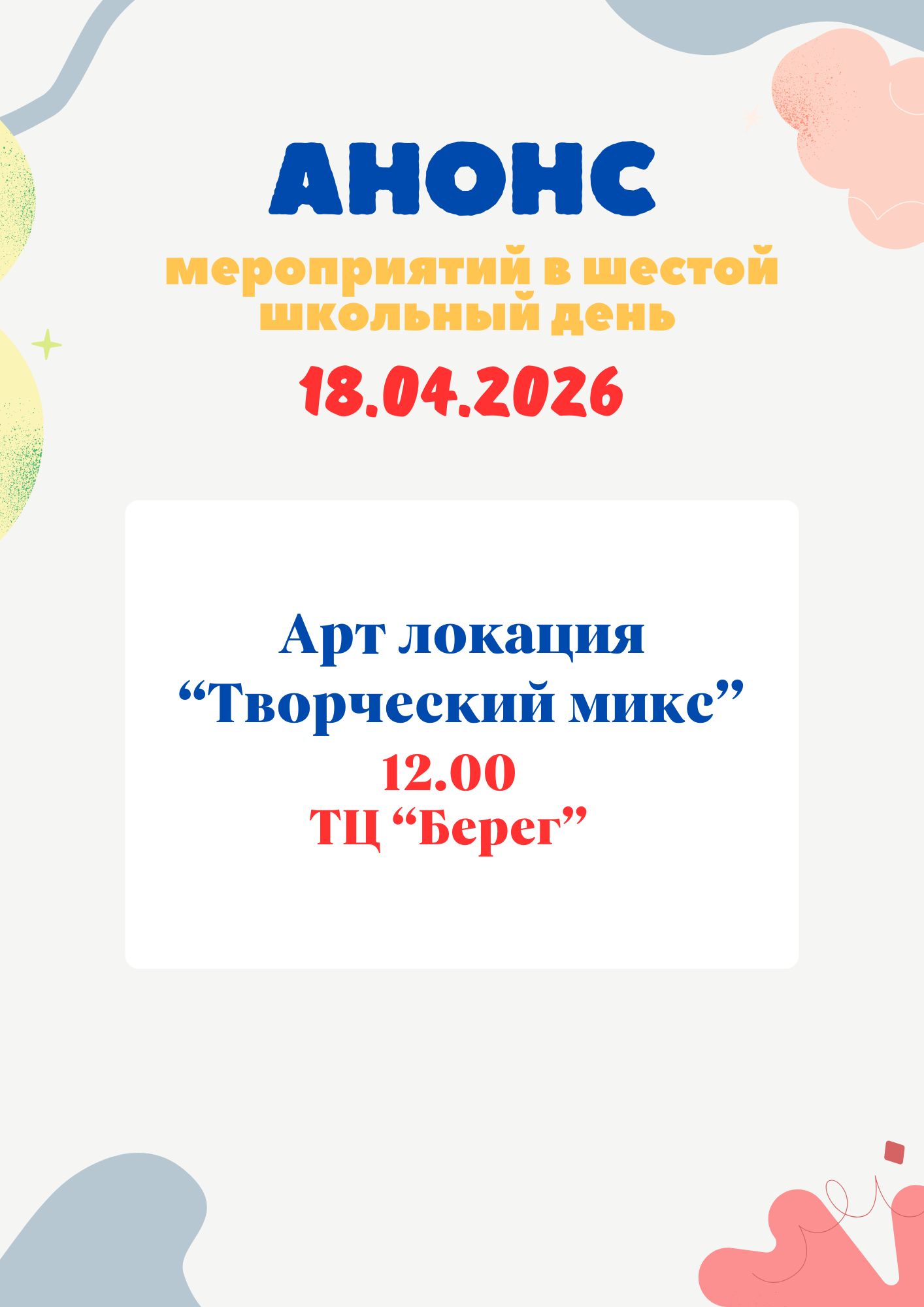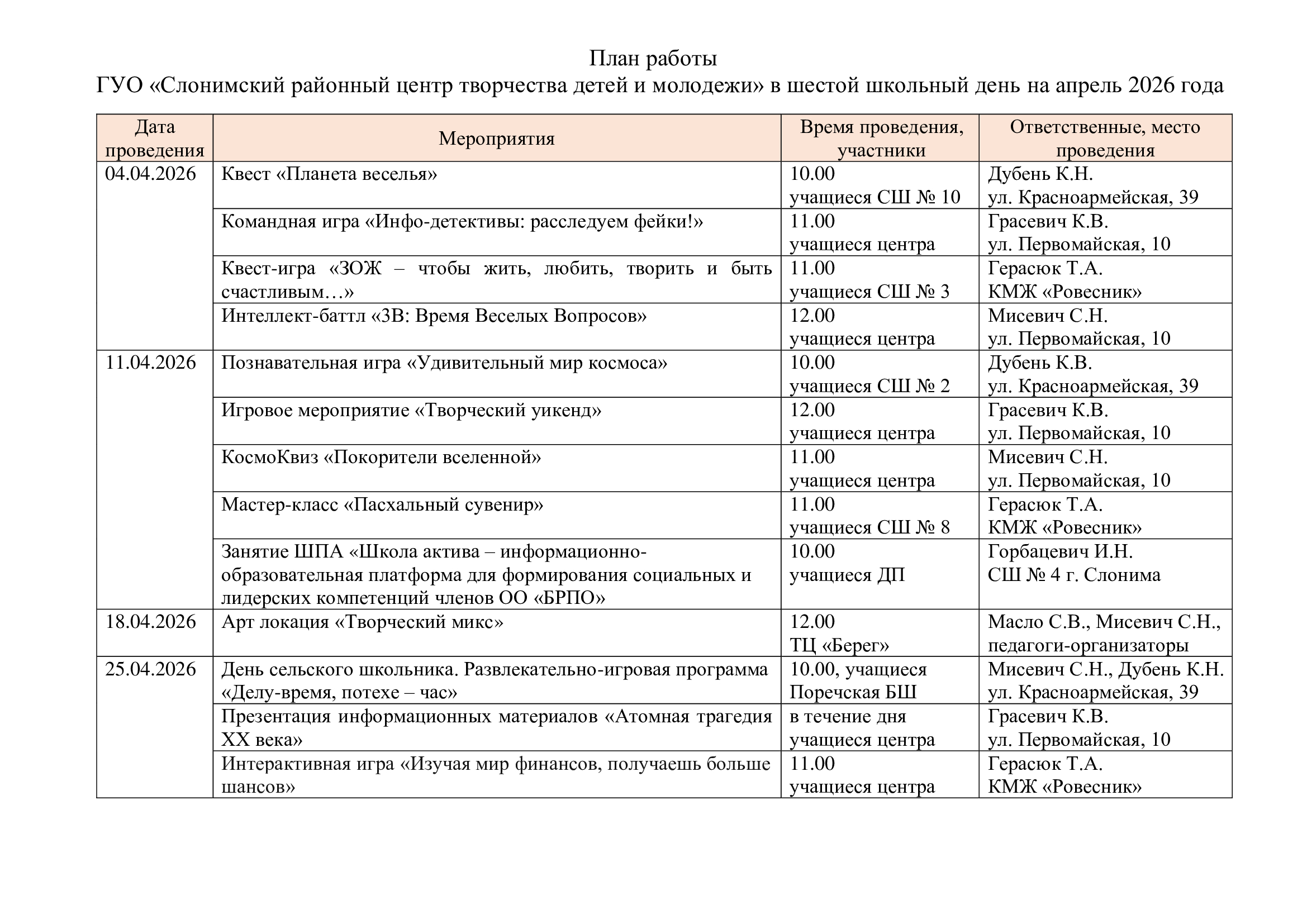 - План работы в шестой школьный день на апрель 2026 года