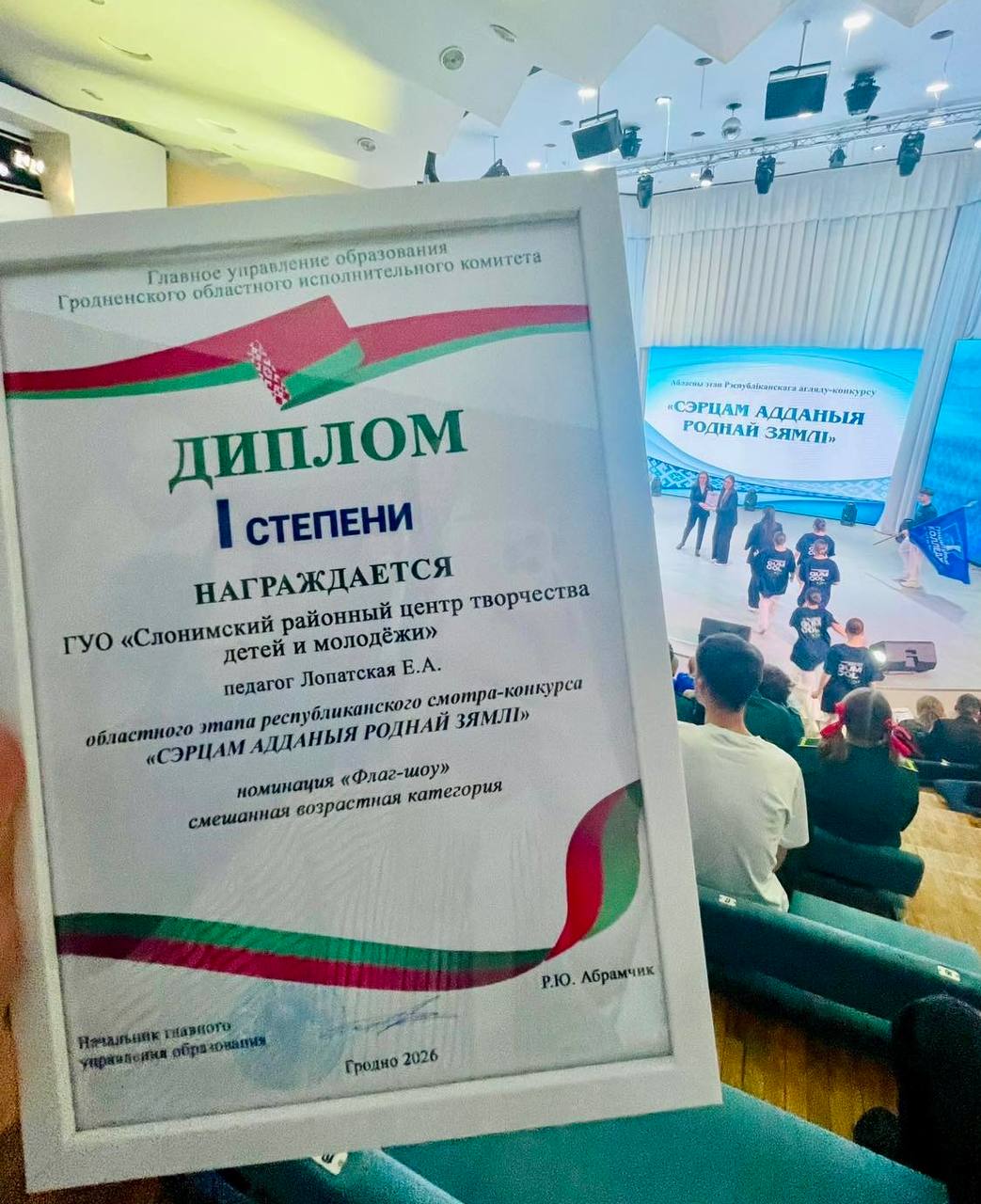 25 февраля 2026 года, коллектив учащихся ГУО "Слонимский районный центр творчества детей и молодёжи" под руководством педагога Лопатской Екатерины Александровны занял ПЕРВОЕ место в областном этапе Республиканского смотра-конкурса "Сэрцам адданыя роднай зямлi" в номинации "Флаг-шоу". Динамичная постановка, запоминающиеся образы, символическое взаимодействие с флагами - это всё передаëт радость и гордость за страну, единство белорусского народа, многогранность белорусской культуры. Поздравляем с заслуженной победой и желаем удачи в финале!